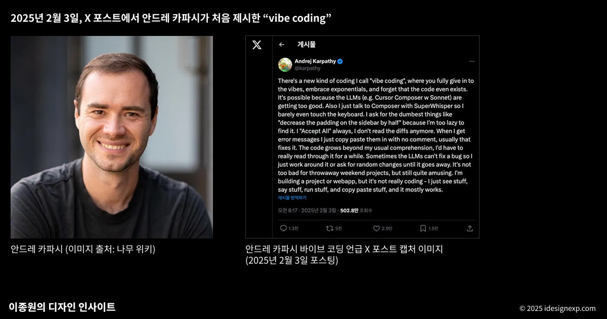 바로 이 시점에, OpenAI의 창립 멤버이자 전 테슬라 AI 디렉터였던 안드레 카파시(Andrej Karpathy)는 자신의 X(aka 트위터) 포스팅을 통해 '느낌 기반 개발(Vibe-driven development)'이라는 개념을 제시하며 이 거대한 흐름에 이름을 붙였습니다. 그는 AI가 코드의 정확한 명세(spec)가 아닌, 개발자의 모호한 '느낌(vibe)'을 이해하고 작동하는 미래를 이야기했고, 이는 수많은 개발자의 공감을 얻으며 '바이브 코딩'이라는 용어가 커뮤니티에 확산되는 기폭제 역할을 했습니다.